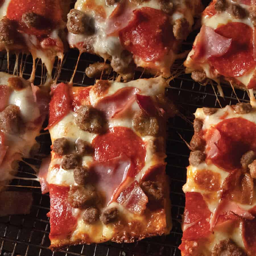 Pizza sauce, premium mozzarella, pepperoni, ham, bacon, Italian sausage & hamburger