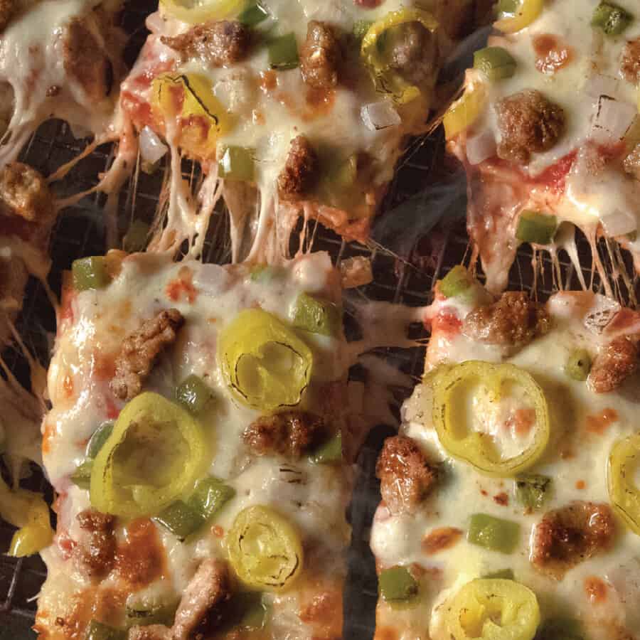 Pizza sauce, premium mozzarella, Italian sausage, onions, green peppers & mild peppers
