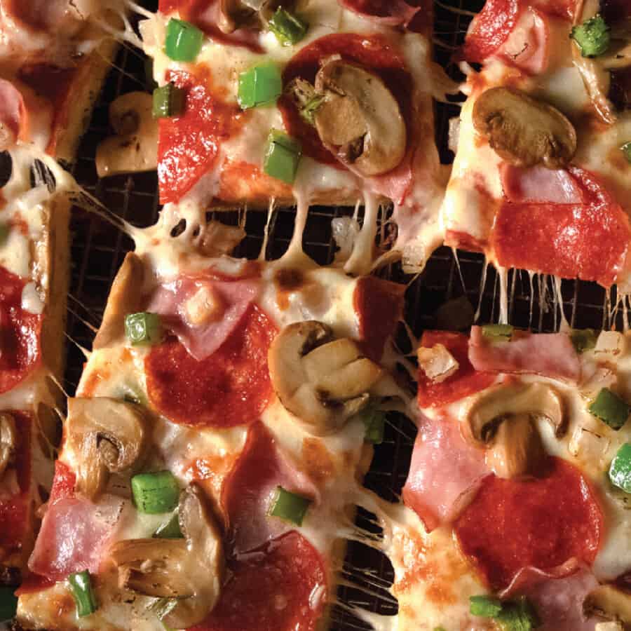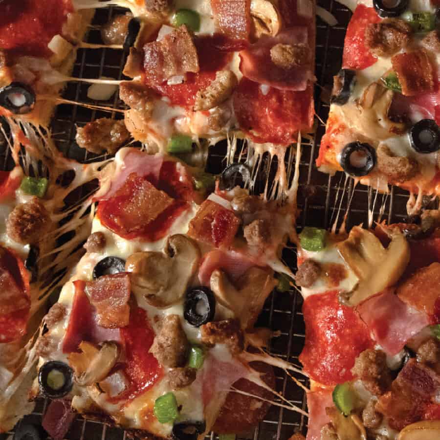 Pizza sauce, premium mozzarella, pepperoni, ham, hamburger, Italian sausage, bacon, mushrooms, onions, green peppers & black olives