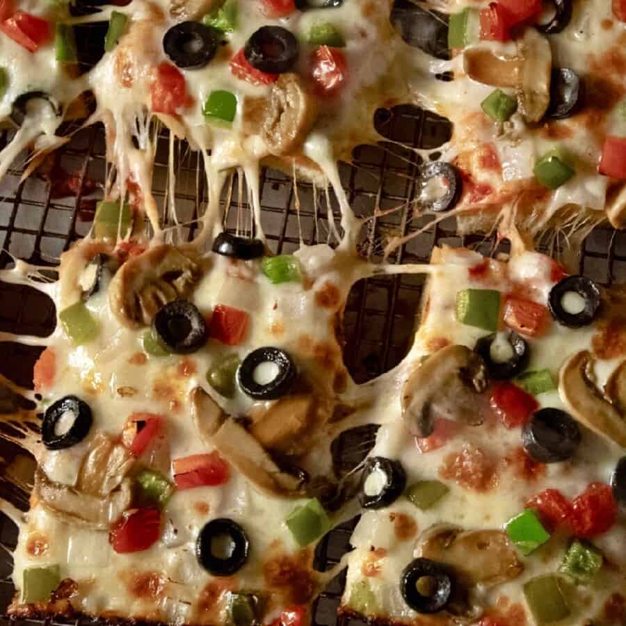 Pizza sauce, premium mozzarella, mushrooms, onions, green peppers, black olives & tomatoes