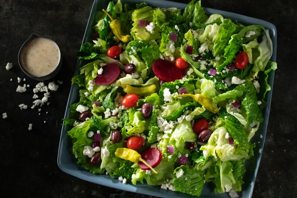 Lettuce, feta, beets, grape tomatoes, Greek olives, red onions & pepperoncini